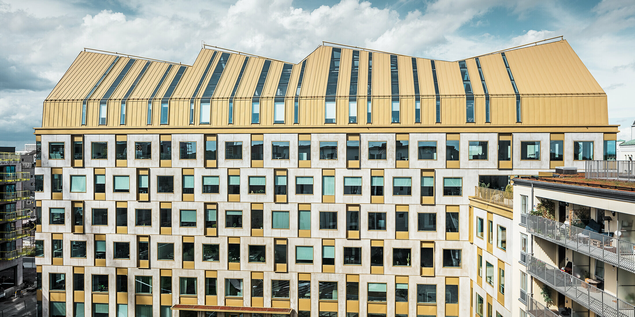 Die tragende Stahlkonstruktion des Dachs ist mit 2.000 m² PREFALZ eingedeckt, deren Beschichtung eine Spezialanfertigung von PREFA ist. Die neu entwickelte Sonderfarbe heißt Gold Jaisalmer-2525, benannt nach der indischen Wüstenstadt Jaisalmer, deren Ruf als goldene Stadt Vorbild für die schimmernde Farbe der Beschichtung war.
