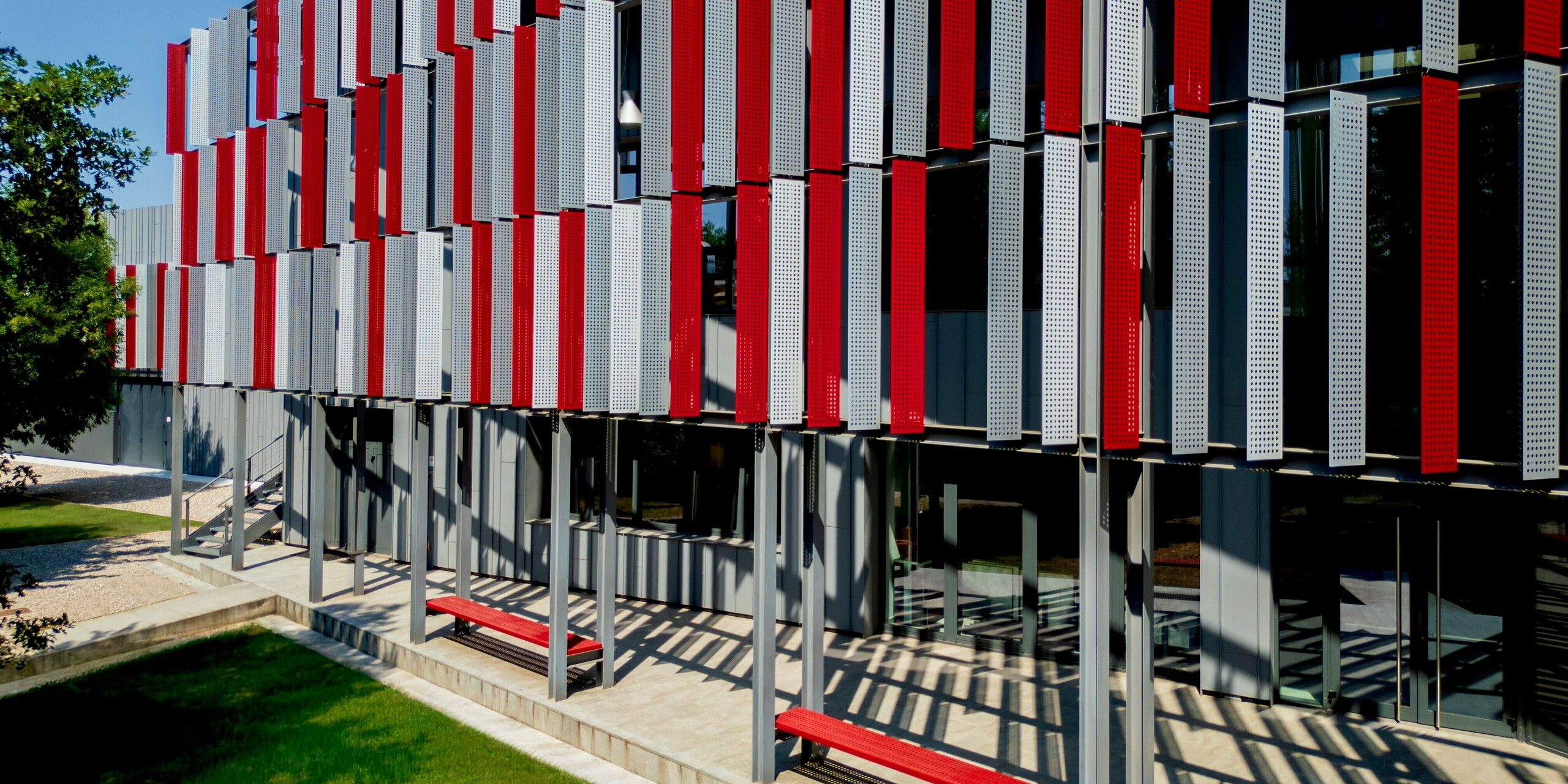 Bereits auf den ersten Blick prägt die vertikale Fassadengliederung in Dunkelgrau und Patinagrau das Erscheinungsbild, das durch dynamische rote Akzente ergänzt wird. Diese farblichen Highlights verleihen dem Gebäude Tiefe und Energie. Die transparenten und perforierten Fassadenelemente schaffen zudem spannende Lichtspiele.