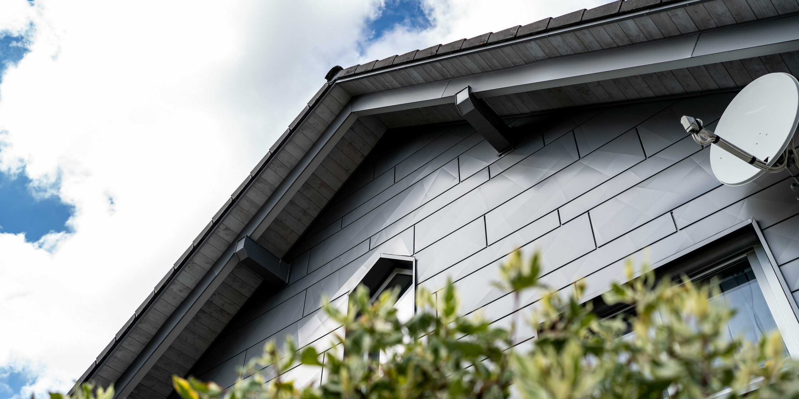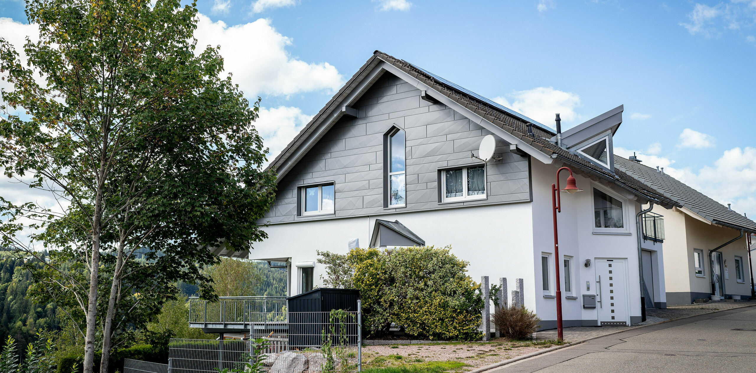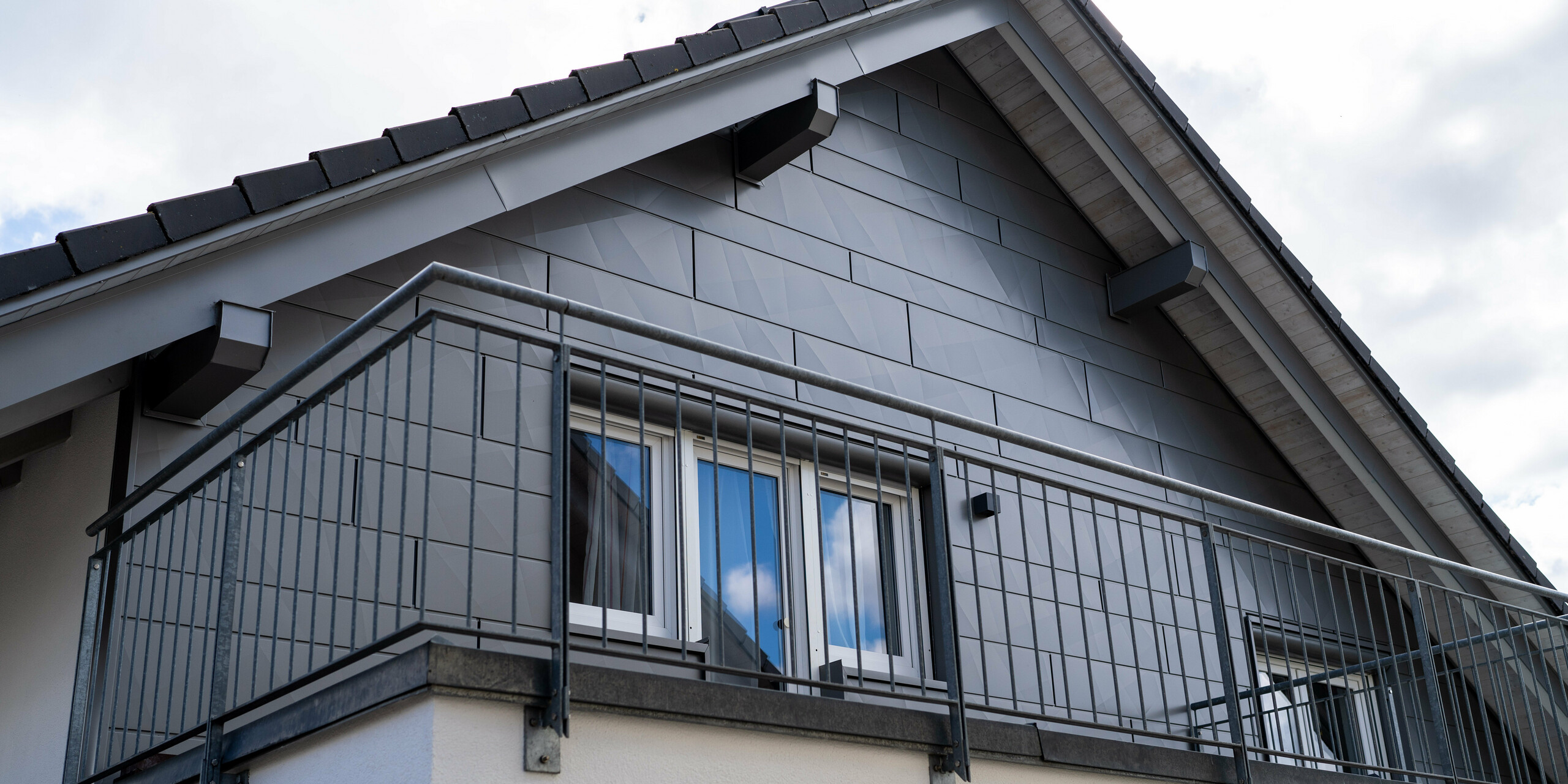 Dans le cas de cette maison individuelle, les pignons, qui étaient à l’origine fabriqués avec un revêtement en bois, sont habillés en aluminium PREFA, le Siding.X en argent fumé, ne nécessitant aucun entretien.