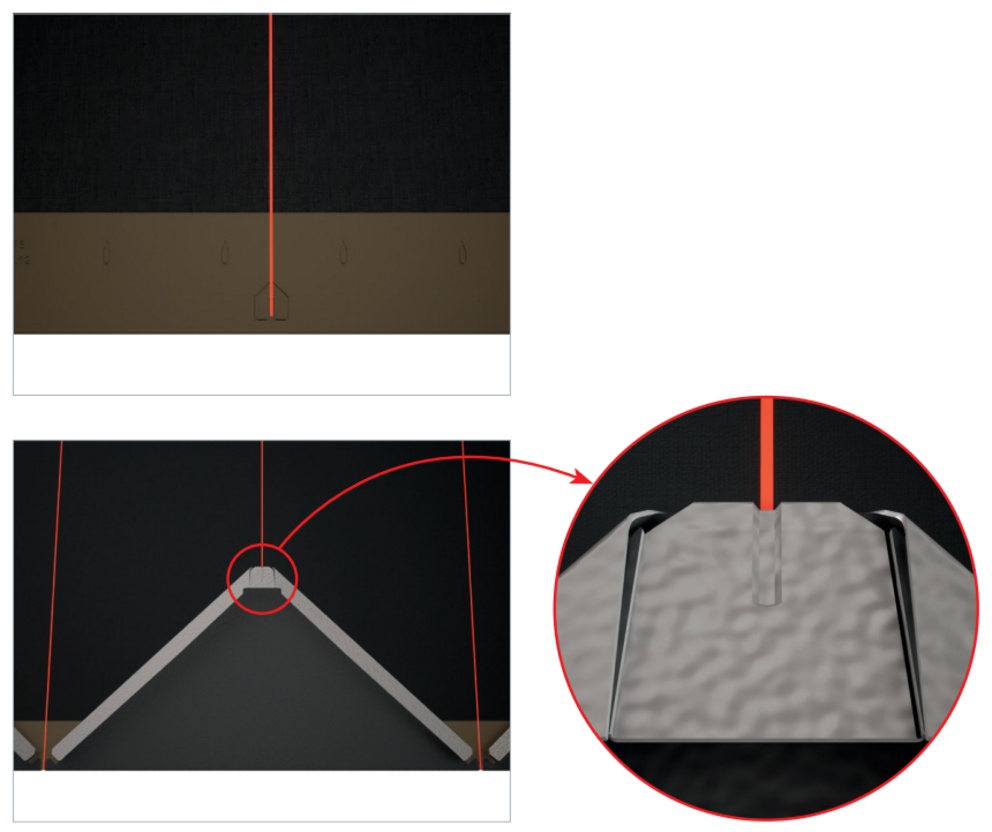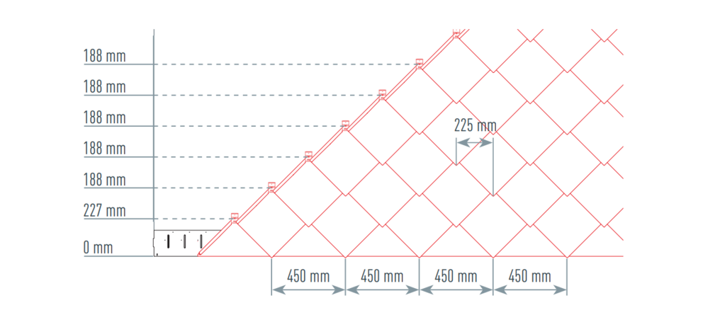 Pour faciliter la pose des losanges de façade PREFA 29 x 29, il est recommandé de réaliser une trame de marques de cordeau verticales espacées de 450 mm (s’aider des repères dans la bande de départ). Pour respecter précisément la cote de traçage dans chaque rangée, on peut si nécessaire marquer aussi la moitié de la cote de traçage et la vérifier à intervalles réguliers. Alignez les demi-losanges de départ en fonction des encoches (sur le bord supérieur des demi-losanges de départ) avec les marques de cordeau verticales (voir figure ci-dessous). Lors de cette opération, veillez à ce que la zone pour le rebord latéral (p. ex. extrémité latérale ou angles de bâtiments) ne corresponde pas au centre des losanges de façade 29 x 29 (respecter la symétrie de la surface de la façade).
