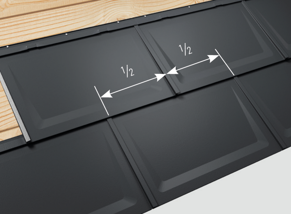Les tuiles R.16 sont toujours posées en quinconce, c’est-à-dire à joints décalés. Afin de faciliter la pose avec un demi-décalage des joints, un repère est apposé sur l’agrafe supérieure de la tuile R.16.