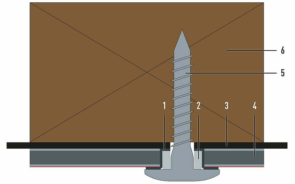 Pour une fixation mécanique sur sous-construction en bois, le point coulissant est réalisé de la même manière que le point fixe. Une seule différence : ne pas insérer de douille de guidage dans le joint d’étanchéité.