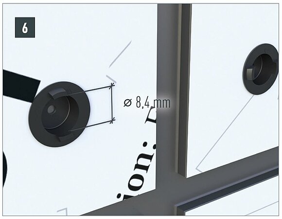 La taille du trou des points de fixations, qu'ils soient fixes ou coulissants, est toujours de 9,5 mm. Le perçage de la sous-construction en bois est effectué à l'aide d’un étrier pour rivet 9,5 mm réduit à 3,3 mm. Ceci permet non seulement d’assurer que la vis pénètre de manière parfaitement centrée et perpendiculaire dans la sous-construction, mais aussi de prévenir tout éclatement du bois. Qu'il s'agisse de points fixes ou coulissants, insérez ensuite le joint d'étanchéité dans chaque trou.
