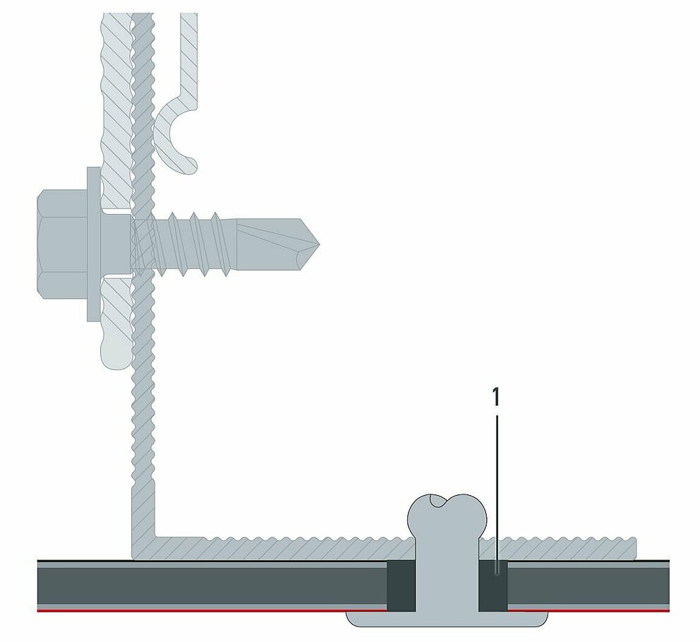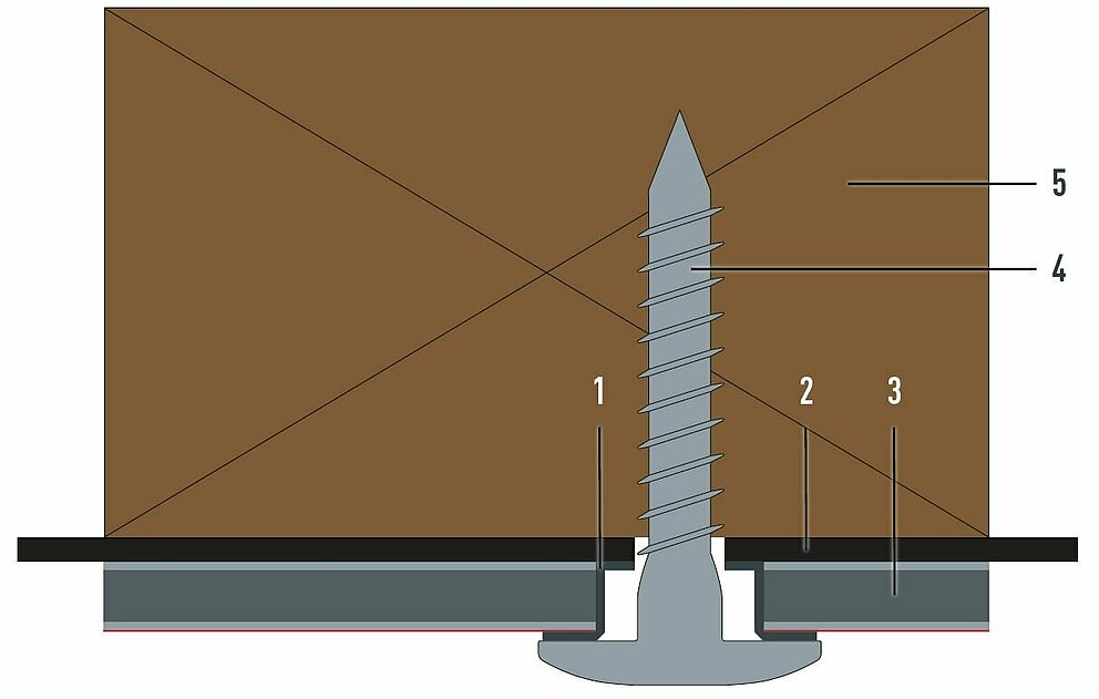 Le diamètre du trou est supérieur à celui de la fixation. Tous les trous de fixation du panneau sont pré-percés avec une perceuse de ⌀ 9,5 mm. Le diamètre de l’avant-trou percé dans la sous-construction est toujours de 5,1 mm Seul ce mode de fixation permet au point coulissant d’absorber la dilatation thermique du panneau.