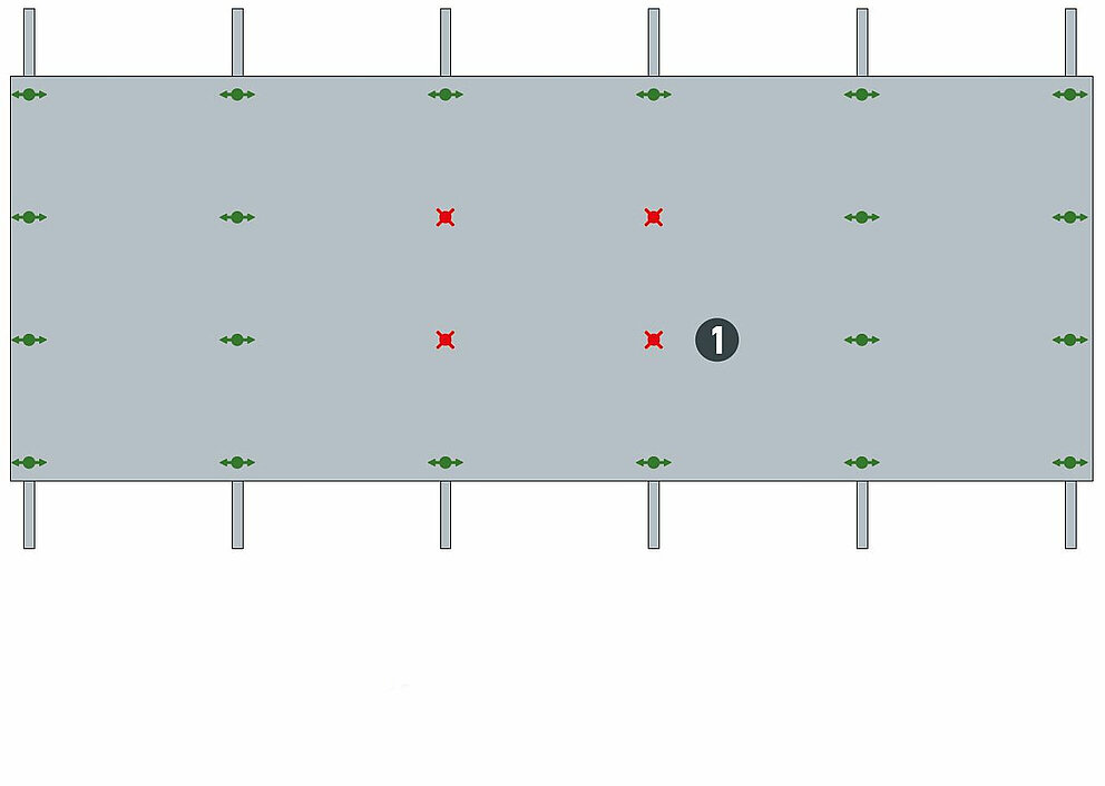 Pour pouvoir absorber correctement la dilatation thermique, ne jamais utiliser de profils porteurs de plus de 3 000 mm de long pour fixer la sous-construction. Veillez à ce que les profils de la sous-construction ne touchent pas un panneau, car la jonction ici est fixe.