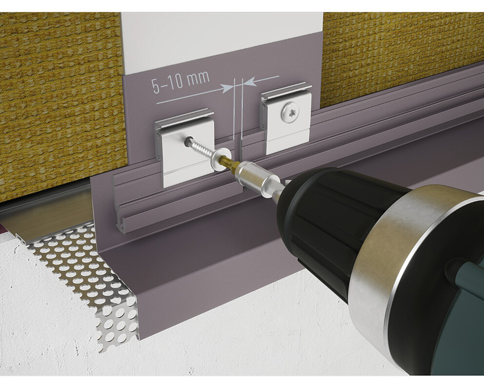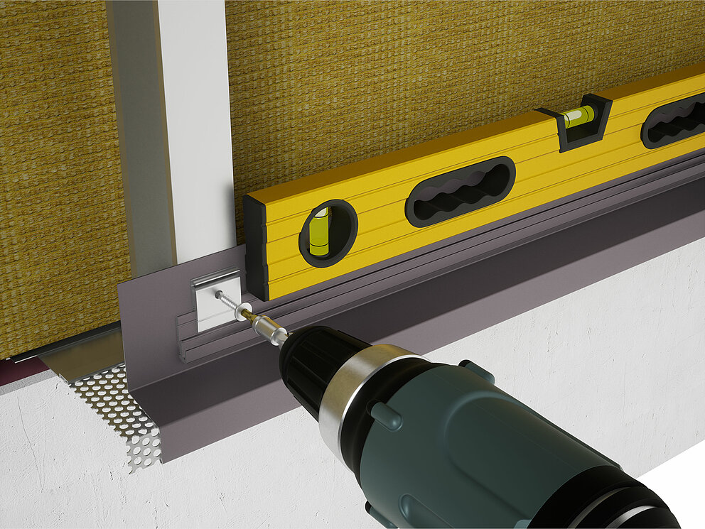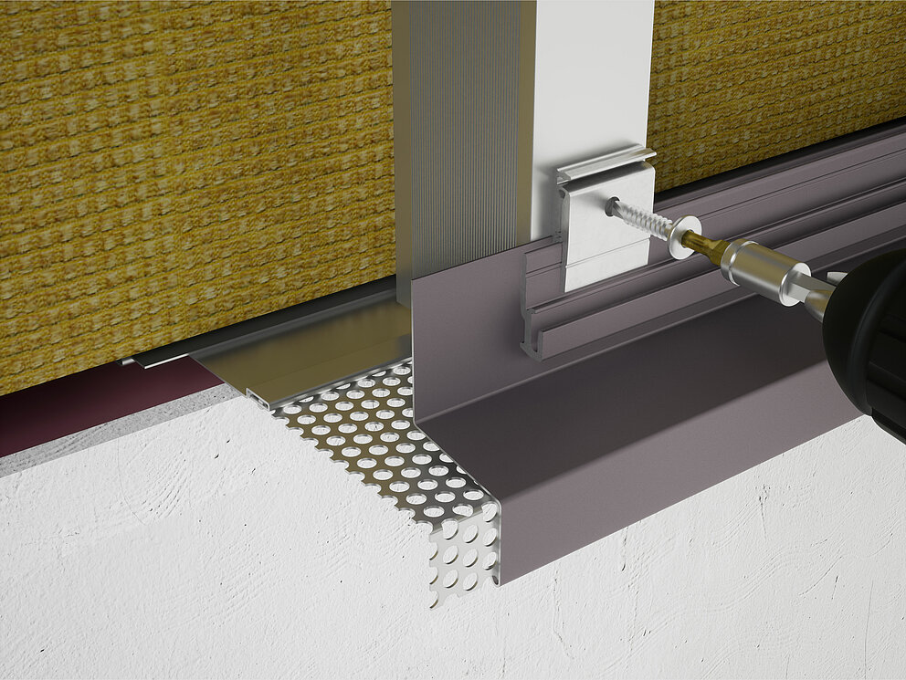 Une fois que vous avez monté les préparatifs de raccordement pour la zone des fondations de la façade ventilée (bande d’aluminium perforée et bande de recouvrement), vous pouvez commencer le montage avec le profil de départ. Le profil de départ est toujours le premier profil utilisé pour la construction d’une façade en profils extrudés.