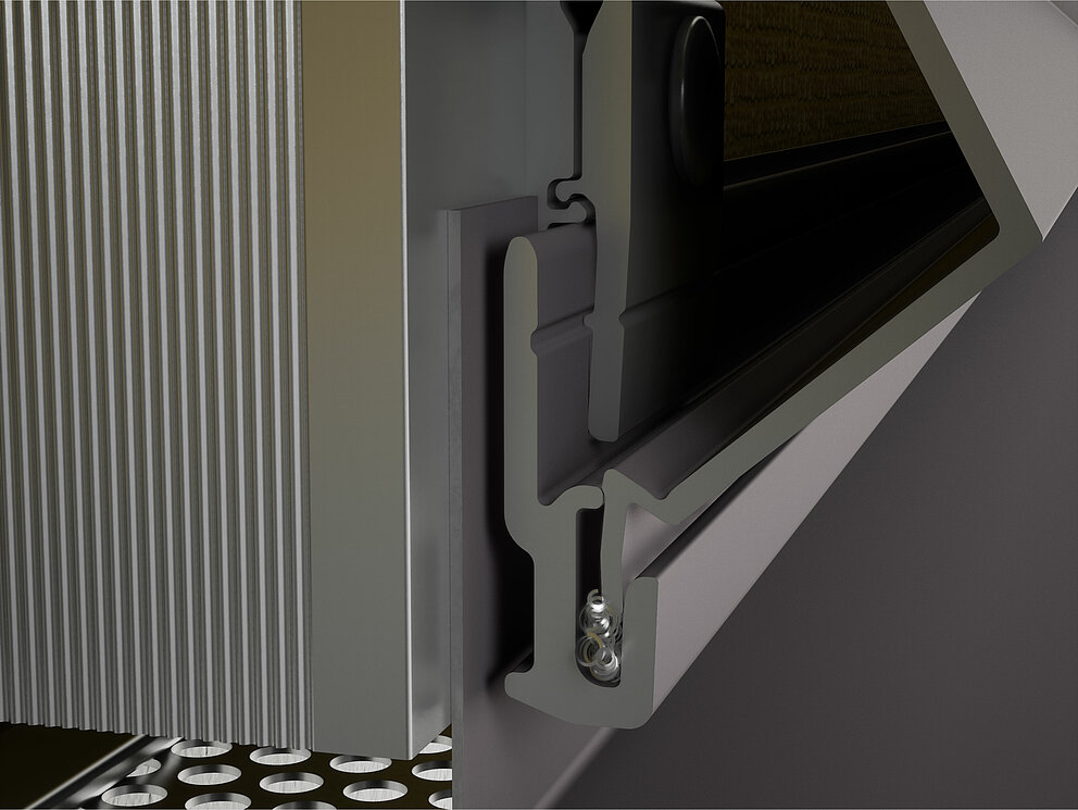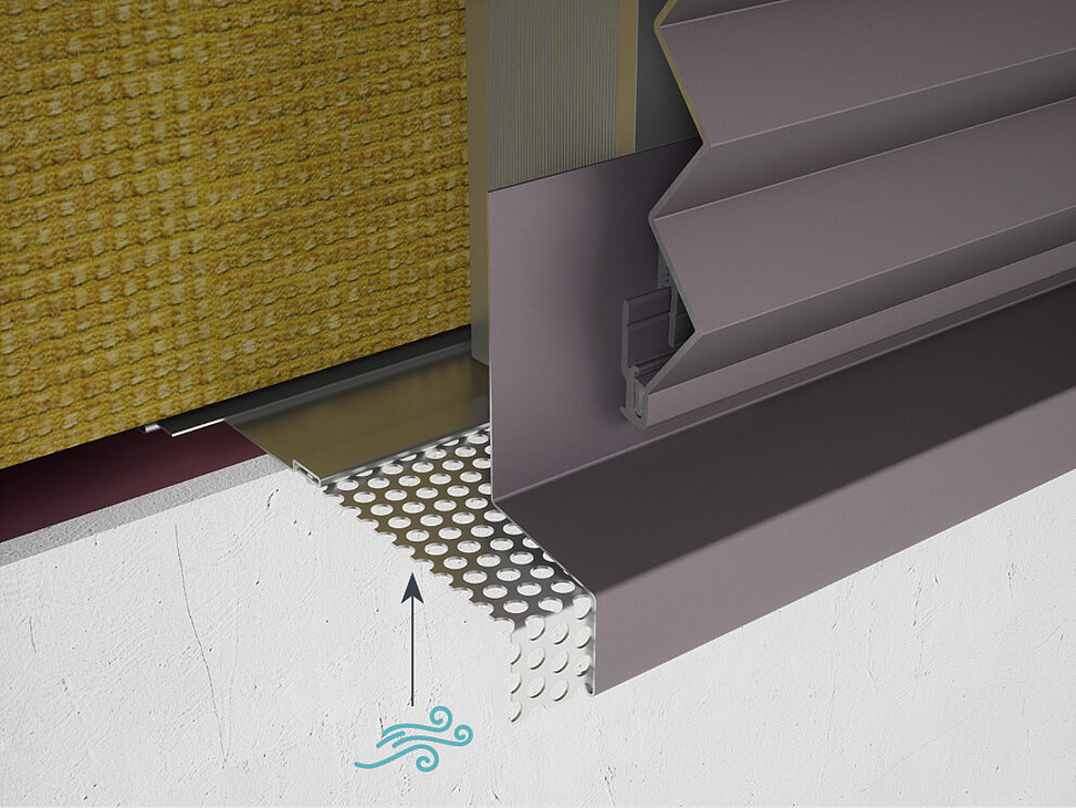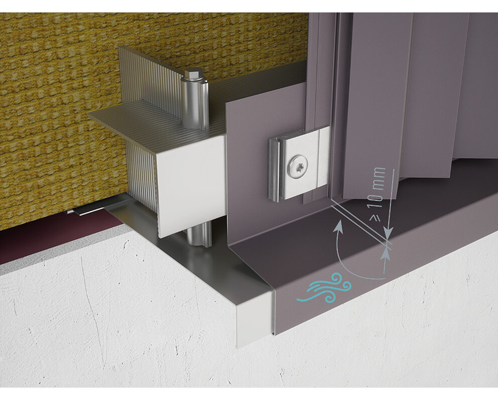 Afin d’assurer une entrée d’air suffisante dans la lame d’air ventilée des profils extrudés, un écart d’au moins 10 mm doit être maintenu entre le bord inférieur du profil et le renvoi d’eau.