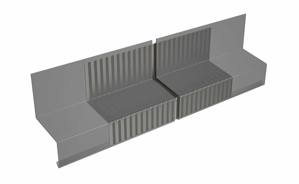 Une fois la sous-construction terminée, commencez par poser le profil de jonction, la bande de recouvrement, la tôle perforée et le renvoi d’eau. Au niveau du renvoi d’eau, les joints doivent être réalisés en chevauchement et collés. Le renvoi d’eau du dessous (dissimulé) est entaillé de façon à permettre le montage du renvoi d’eau situé au-dessus.
