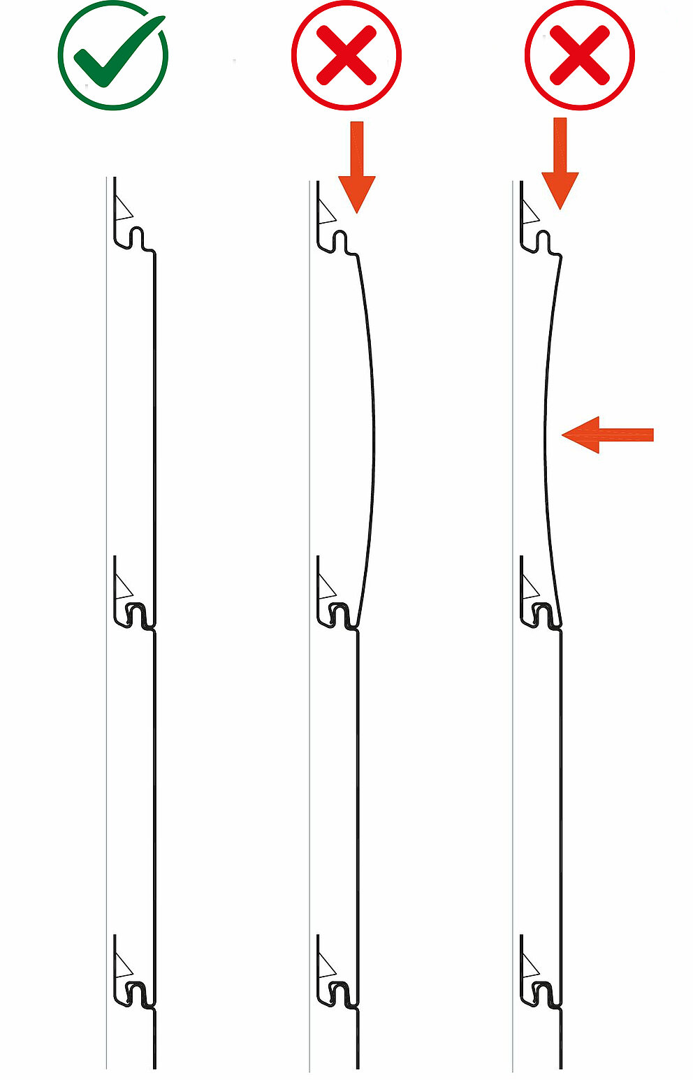 Notez bien que la pose doit être réalisée sans contrainte. N’insérez pas les produits Siding, Siding.X et Siding perforé les uns dans les autres en exerçant une pression trop forte : cela pourrait générer des tensions. Les produits Sidings doivent être posés parfaitement à plat contre la sous-construction, afin d’éviter une déformation concave ou convexe.
