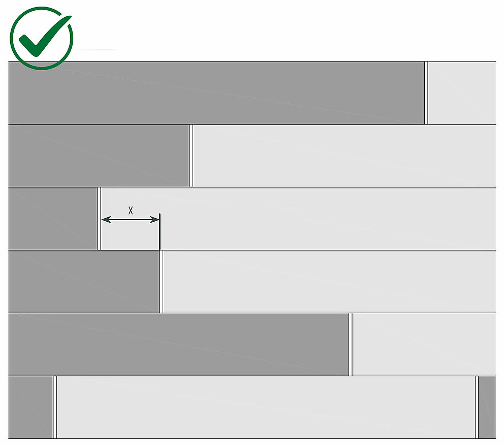 PREFA recommande un décalage (x) correspondant à au moins la largeur utile (LU) posée (par ex. pour un Siding 138×0,7 mm = décalage min. 138 mm) :