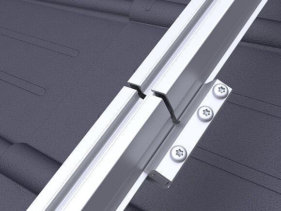 L’insert de jonction doit être monté de manière à ce que les vis de fixation se trouvent en premier lieu du rail. La distance entre les deux rails, indiquée par gravure, doit être respectée afin de permettre l’expansion de chaque rail en fonction de la température.