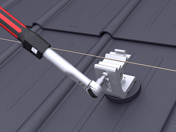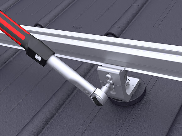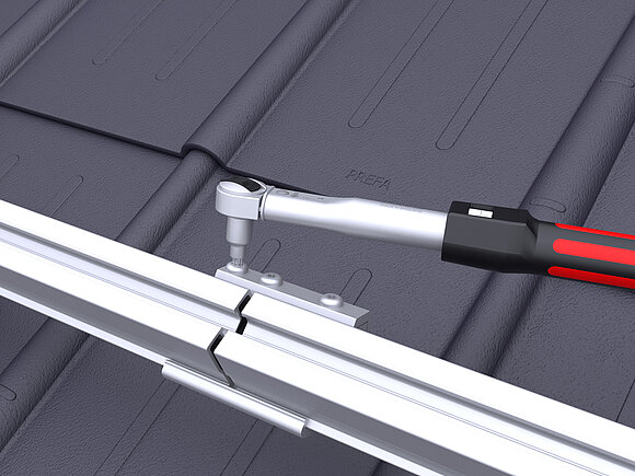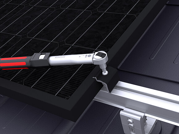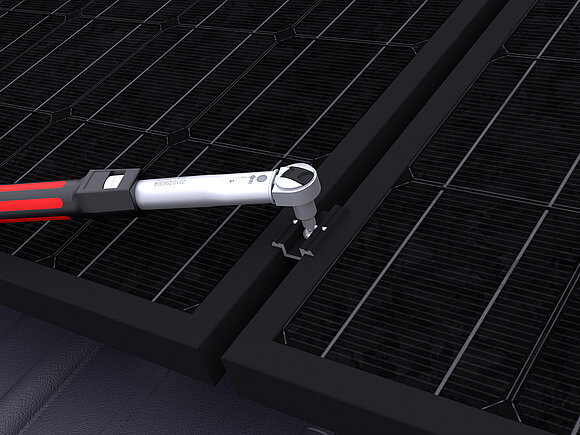 Ensuite, les modules sont placés et les bornes centrales et bornes de fin sont serrées avec un couple de 15 Nm.