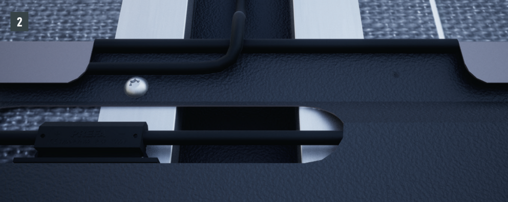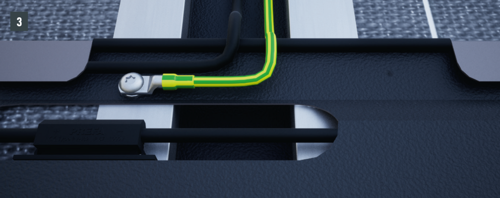 Les tuiles solaires recouvrant le canal de câble doivent être, en plus, vissées avec une vis à tête bombée (voir Fig. 2). Le canal de câble doit donc être constituée d’une pièce de bordure en aluminium, afin de créer une liaison conductrice verticale supplémentaire entre les tuiles solaires.