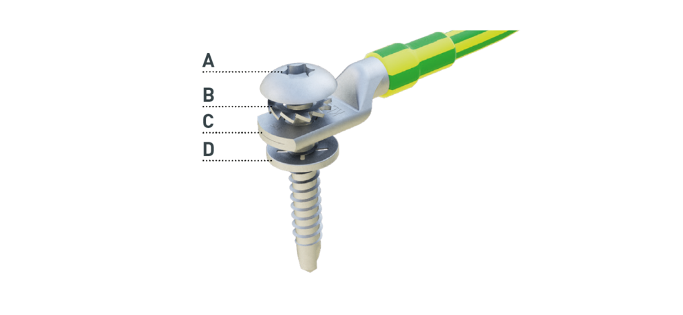 L’élément se compose également de la vis de montage (A), de l’écrou à dent d’arrêt (B), du contact en acier inoxydable (C) et du frein de vis (D) (voir figure ci-dessous).
