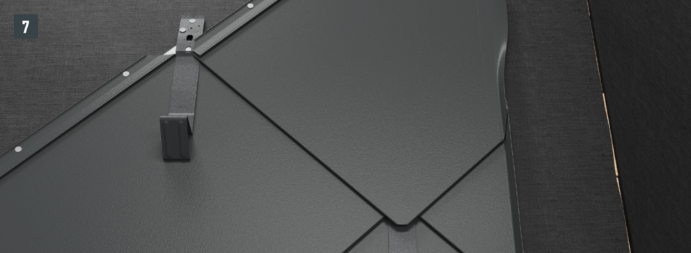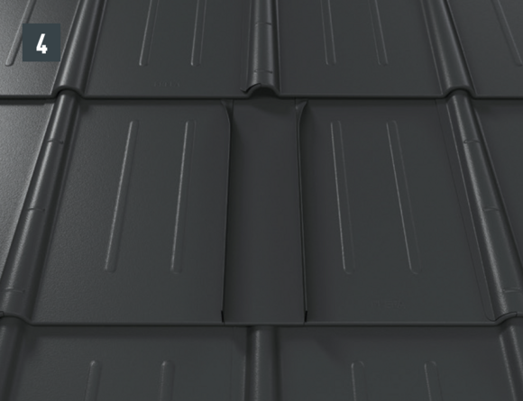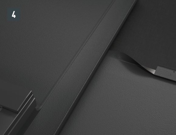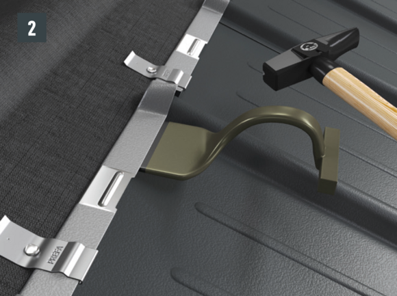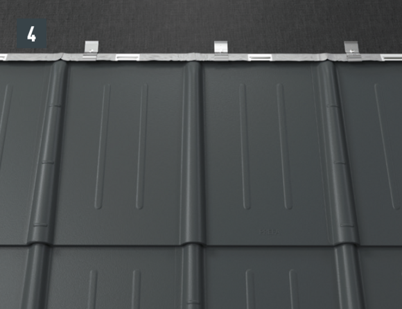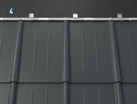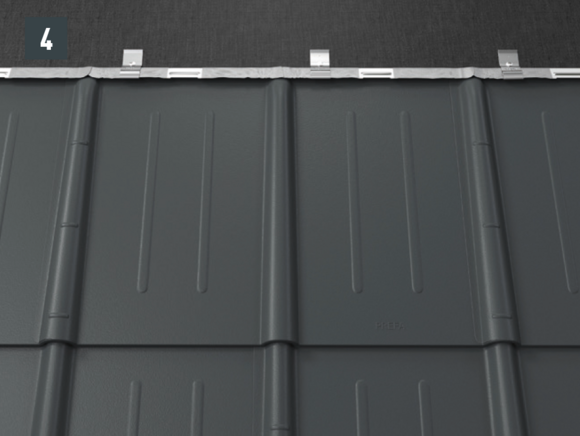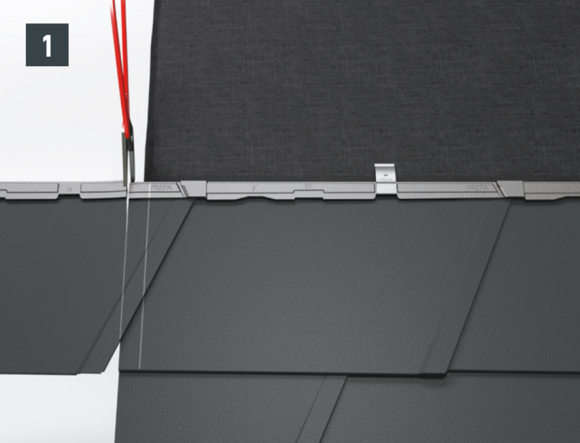 Après avoir posé les tuiles jusqu’à l’emplacement souhaité pour la plaque de support, il faut ajuster le rabat supérieur des tuiles de manière qu’il soit possible d’accrocher la plaque de support.