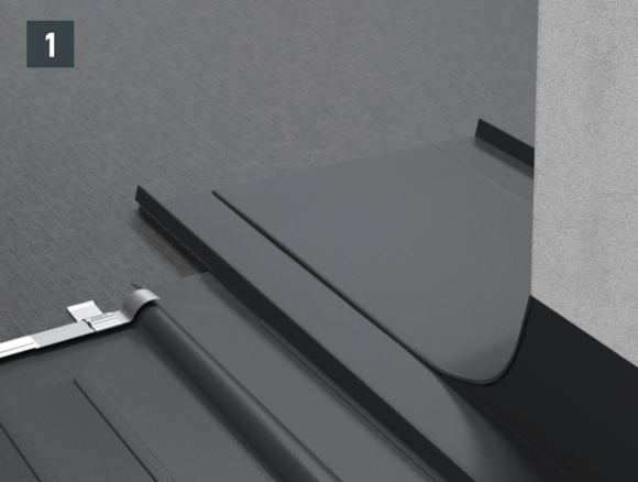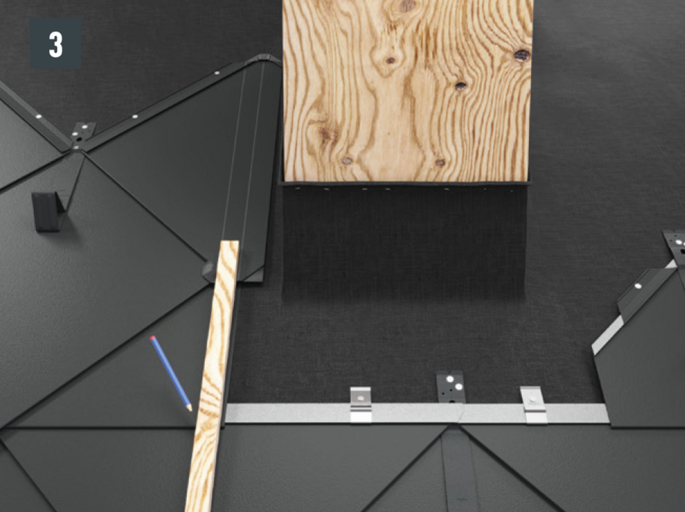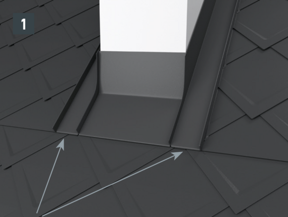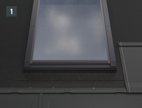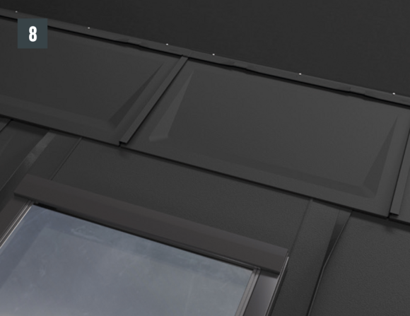 Afin de préparer le raccord avant de la tabatière, des demi-losanges de fin pour losanges de toiture 29 × 29 ou 44 × 44 doivent être posés. Ils permettent d’obtenir une agrafe d’accroche bien horizontale et un raccordement parfaitement protégé.