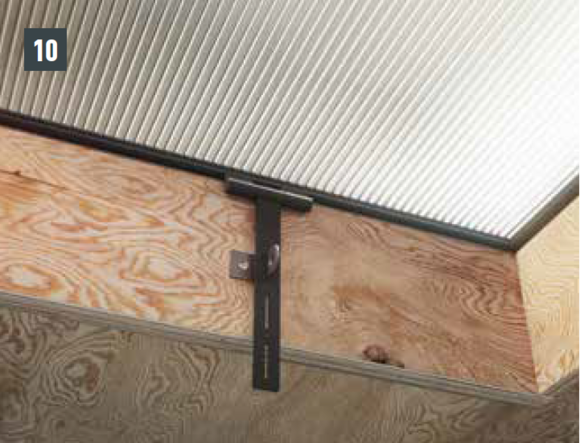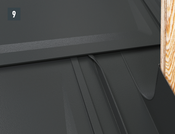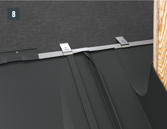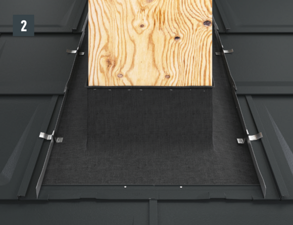 Préparez l’abergement (devant de cheminée et les couloirs) et fixez-le aux couloirs sur la volige à l’aide de pattes de maintien (Fig. 10 et 11).