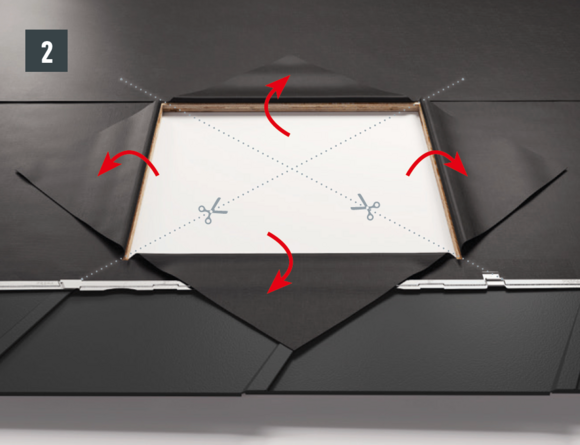 Afin de préparer l’abergement bas du raccordement de la fenêtre de toit, des demi-losanges de fin pour losanges de toiture 29 × 29 ou 44 × 44 doivent être posés. Ils permettent d’obtenir une agrafe d’accroche bien horizontale et un raccordement parfaitement protégé.
