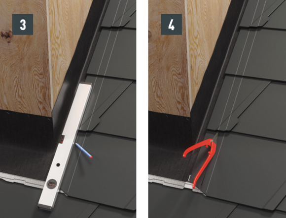 Le relevé de la couverture de toit par rapport aux agrafes latérales est déterminé par l’abergement. Vous devez donc mettre en place les abergements bas et haut contre la fenêtre de toit et marquer la position du relevé.