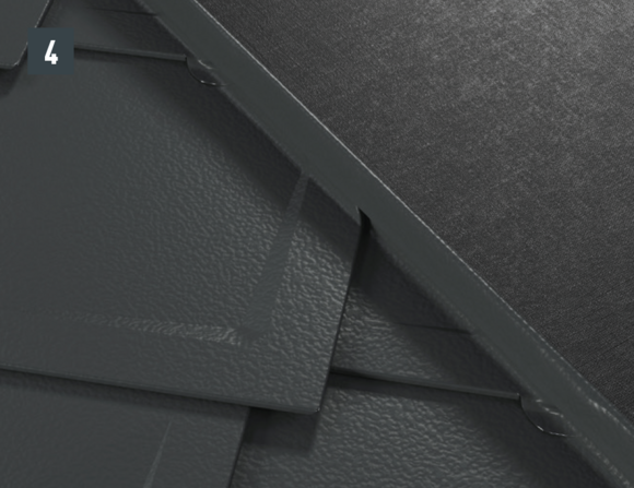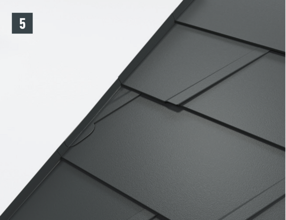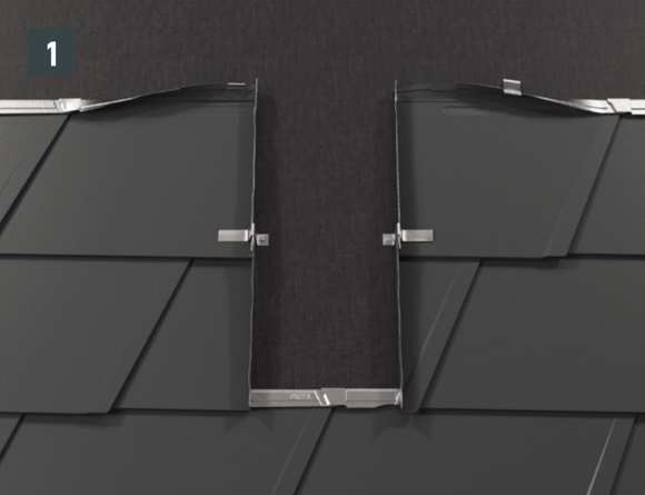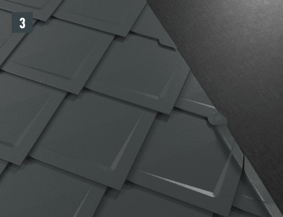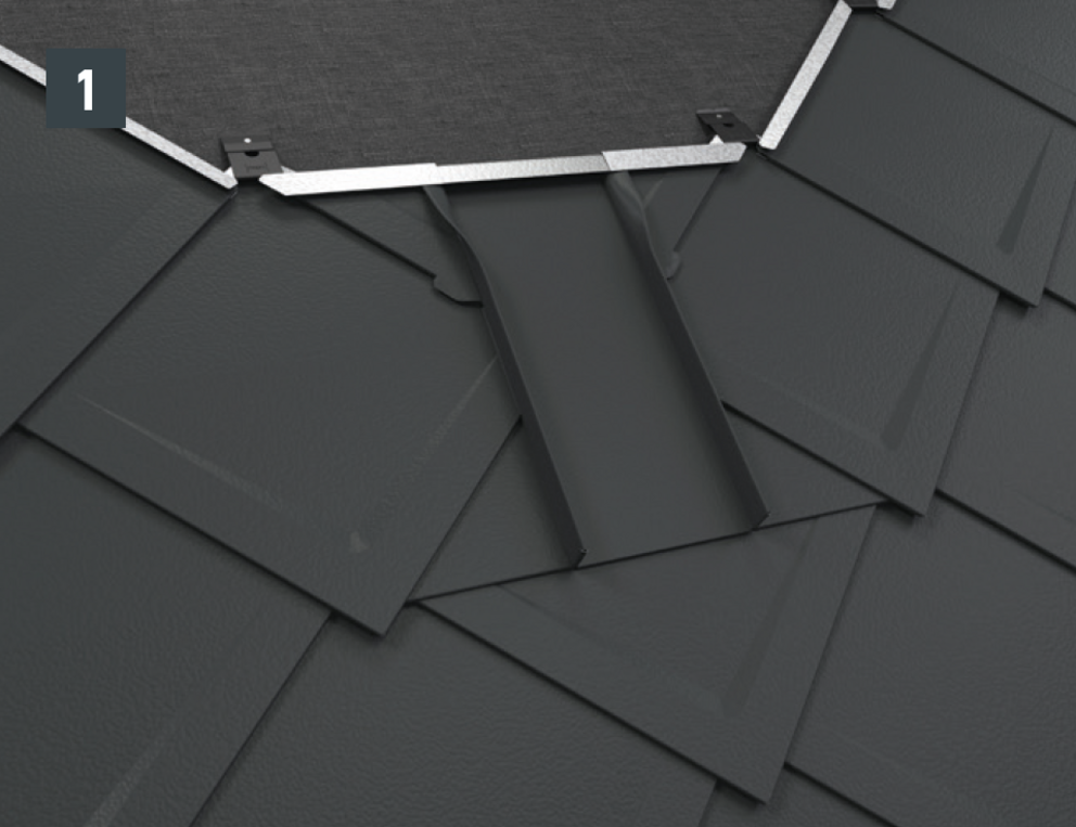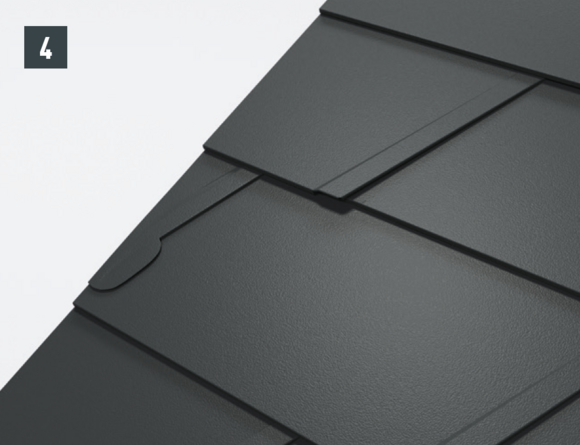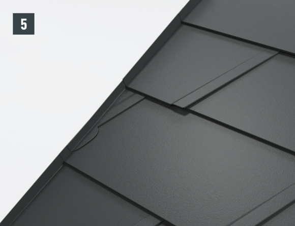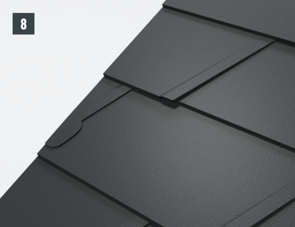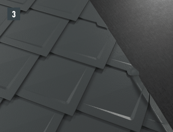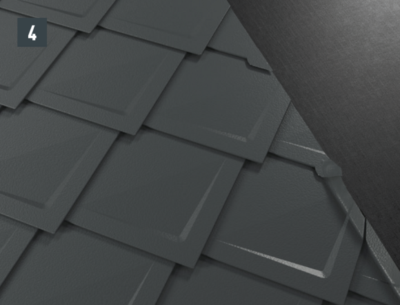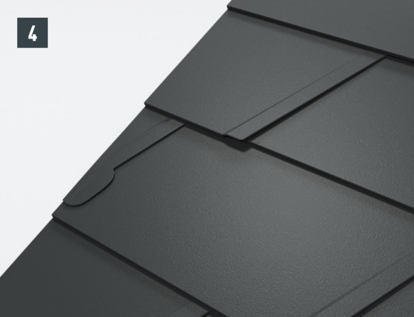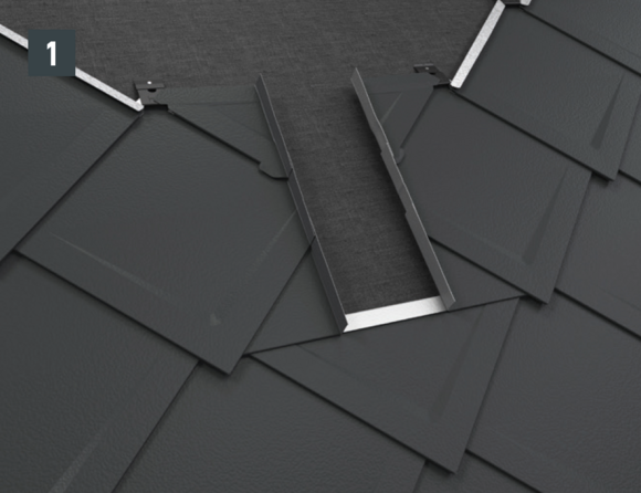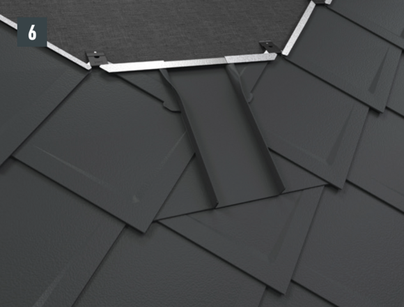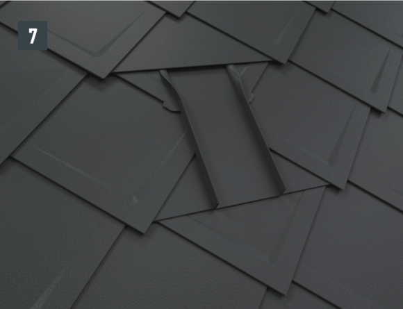 Il est à présent possible de monter sur l’abergement les demi-losanges de départ pour losanges de toiture 29 × 29 ou 44 × 44 et de poursuivre la couverture.
