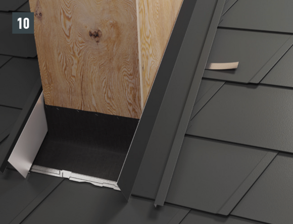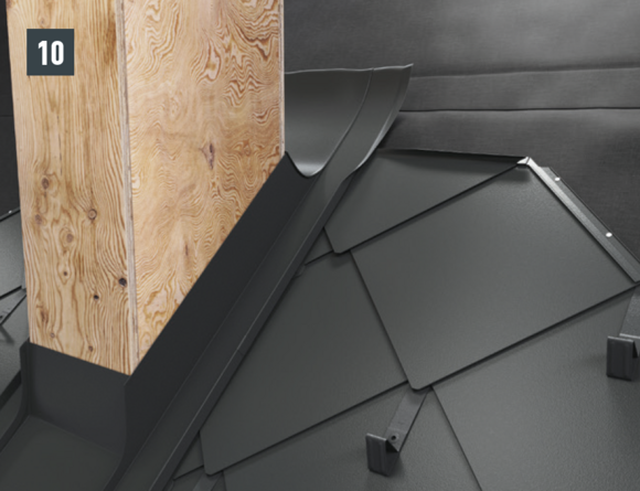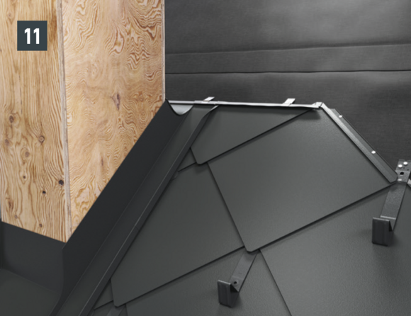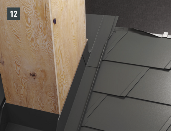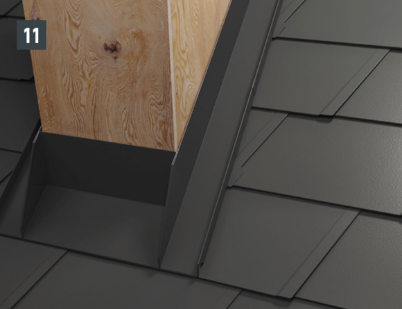 Pliez la partie supérieure du relevé de couloir vers l’extérieur (Fig. 10) et coupez le couloir et le derrière de cheminée en laissant 30 mm supplémentaire au-dessus de la ligne de pureau (Fig. 11). Réalisez la pince – il est maintenant possible de monter sur l’abergement les demi-losanges de départ pour losanges de toit 29 × 29 ou 44 × 44 et de poursuivre la couverture.