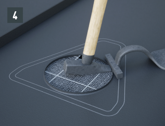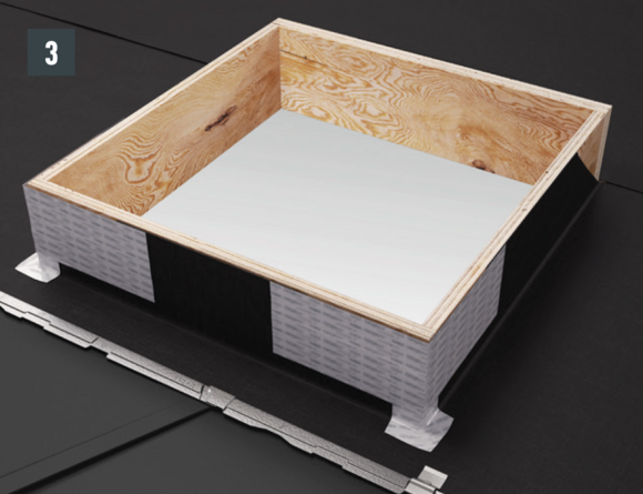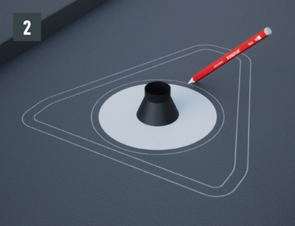 Le voligeage et la couche de séparation doivent être découpés en fonction de la section d’évacuation (diamètre ~10 cm). Sur la couverture de toit, il faut réaliser une rehausse de 1 cm de hauteur sur tout le tour, en bordure des découpes.