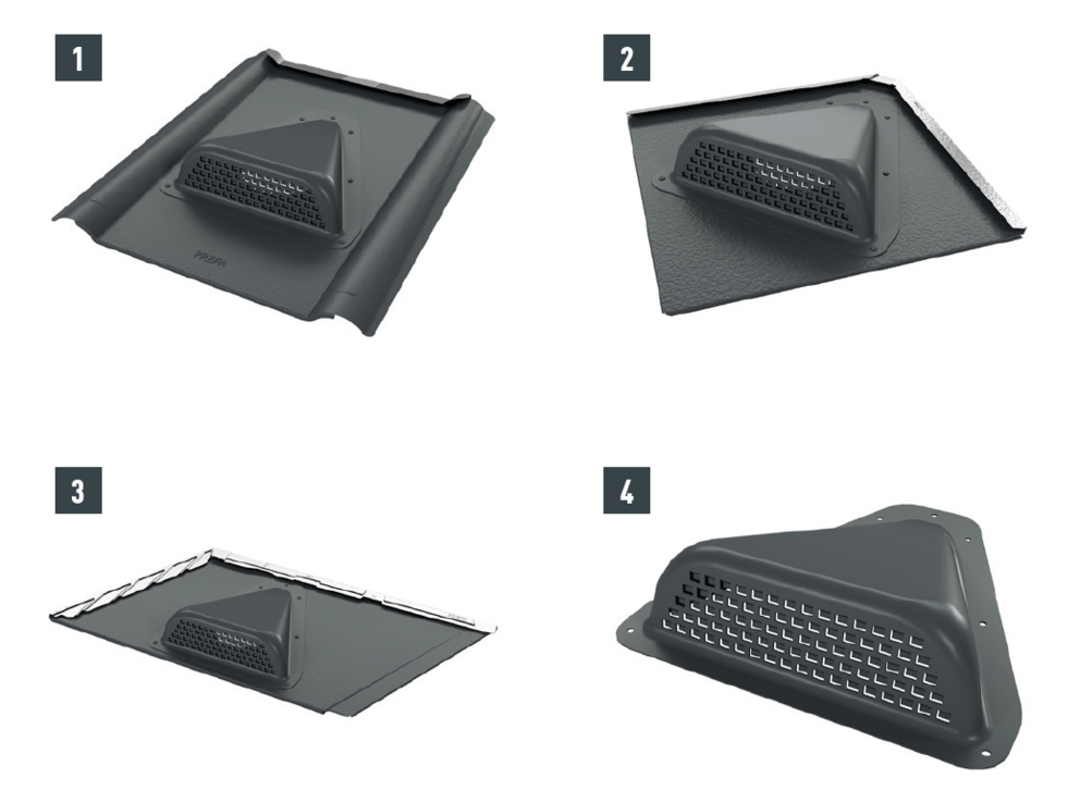 Les raccordements de ventilation pour losanges de toiture 29 × 29 (1), losanges de toiture 44 × 44 (2), R.16 et panneaux de toiture FX.12 (3) et DS.19 (4) sont aux dimensions du système de toit PREFA concerné et peuvent être intégrés facilement dans la couverture.