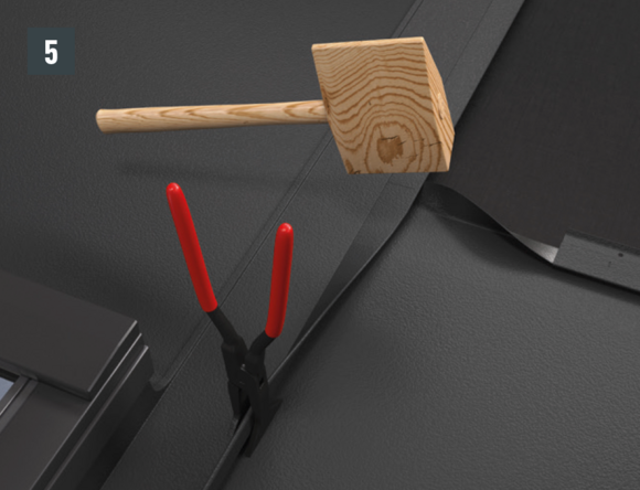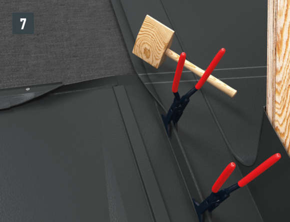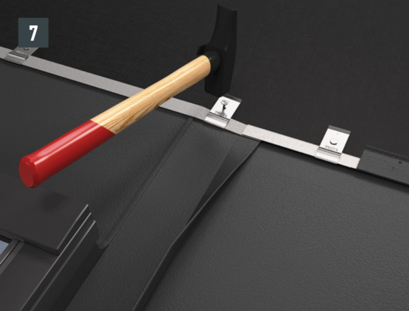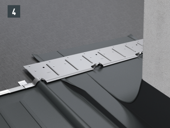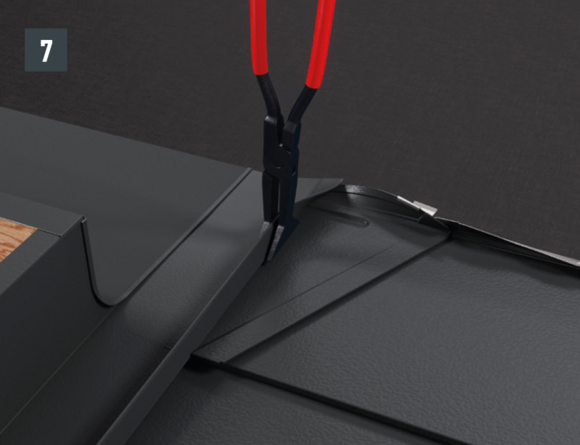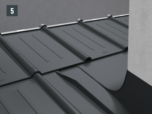 Au niveau de l’abergement haut du raccordement, l’agrafe d’accroche supérieure du R.16 ou du panneau de toiture FX.12 à poser est découpée sur environ 200 mm. Ouvrez l’agrafe et réalisez le relevé de couloirs à 90° (Fig. 5 et 6). le raccord est mis en place.