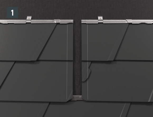 Pour le montage de la plaque de support, il faut poser des demi-losanges de début et de fin pour les losanges de toiture 29 × 29 ou 44 × 44. Ils permettent d’obtenir une agrafe d’accroche bien horizontale et un raccordement parfaitement protégé (Fig. 1).