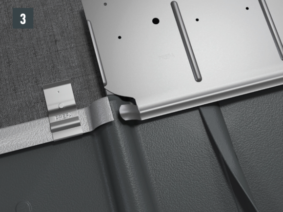 Après avoir posé les tuiles jusqu’à l’emplacement souhaité pour le raccordement de la fenêtre de toit, il faut ajuster l'agrafe supérieure des tuiles de manière à ce qu’il soit possible d’accrocher le devant de la fenêtre de toit PREFA.