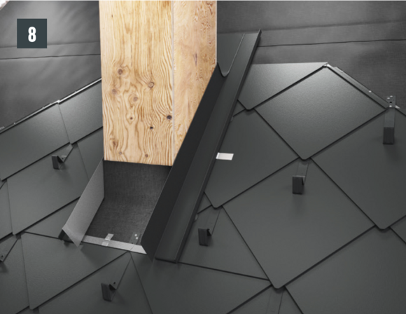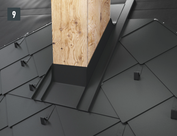 Faites remonter les bardeaux et DS.19 jusqu’à pouvoir poser la dernière rangée de la couverture PREFA sous la cheminée.