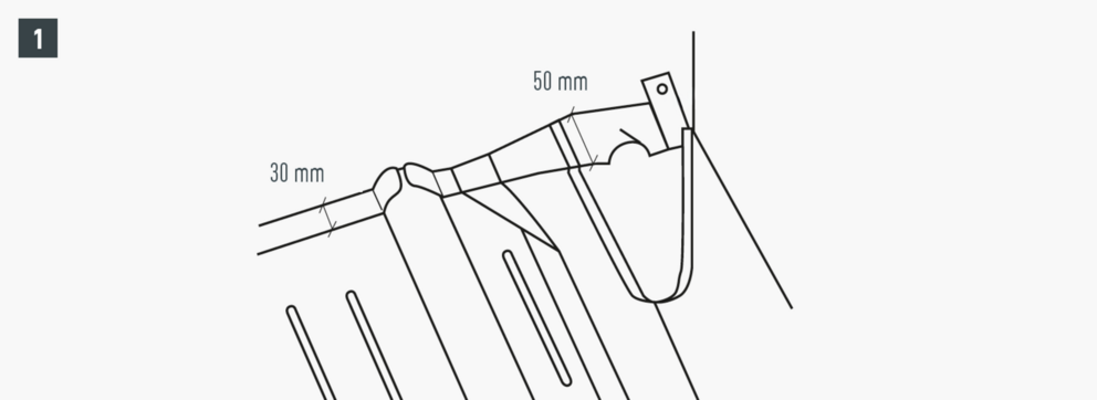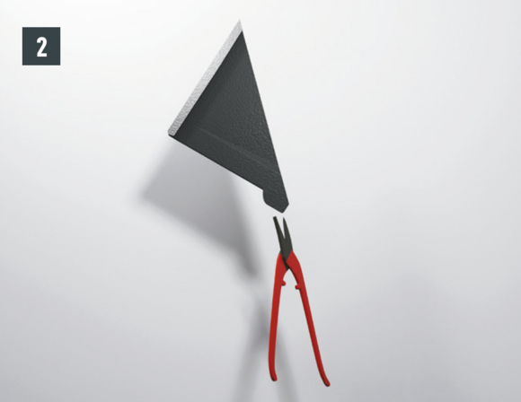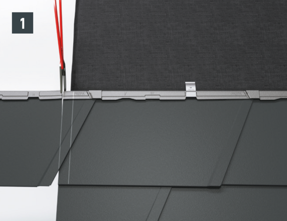 Au niveau où doit être réalisé le pliage vers le haut, découpez l’agrafe brevetée supérieure de manière à laisser une agrafe d’accrochage et pliez la tuile R.16 ou le panneau de toiture FX.12 à 30 mm vers le haut, à angle droit par rapport à la surface du toit (Fig. 1+2).