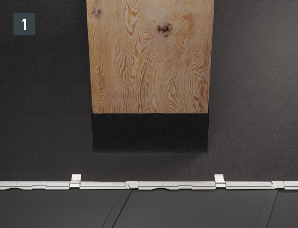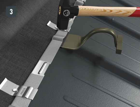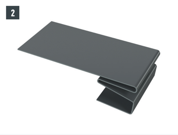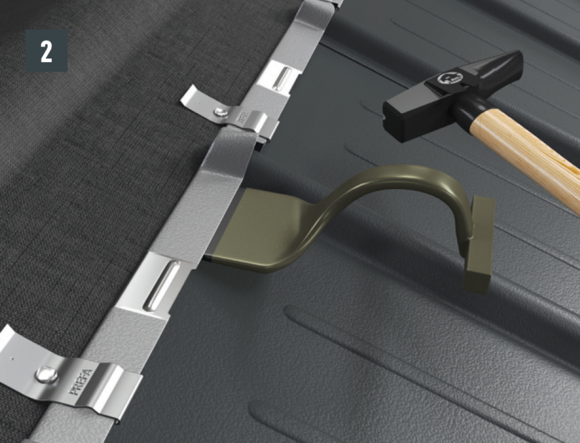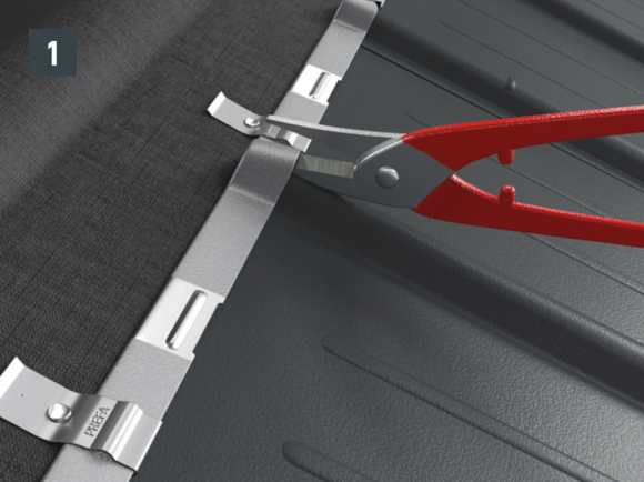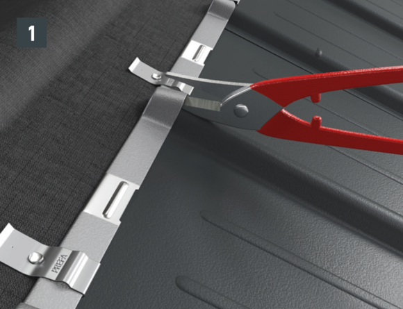 Au niveau où doit être réalisé le pliage vers le haut, découpez l’agrafe brevetée supérieure de manière à laisser une agrafe d’accrochage et pliez la R.16 ou le panneau de toiture FX.12 à 30 mm vers le haut, à angle droit par rapport à la surface du toit (Fig. 1 et 2).