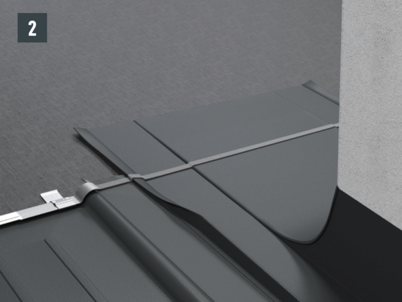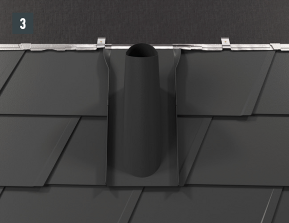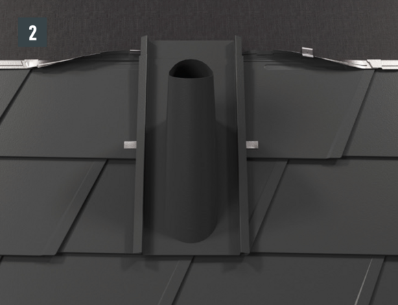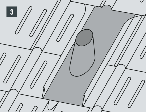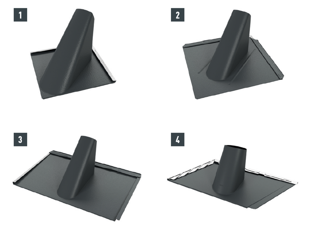 Si la forme et la situation de la pénétration ne permettent pas de faire glisser le raccordement de ventilation (par ex. antenne ou antenne parabolique), il est possible d’utiliser un raccordement universel en deux éléments. La liaison à la couverture est réalisée avec des double plis, comme pour le raccordement à agrafer.