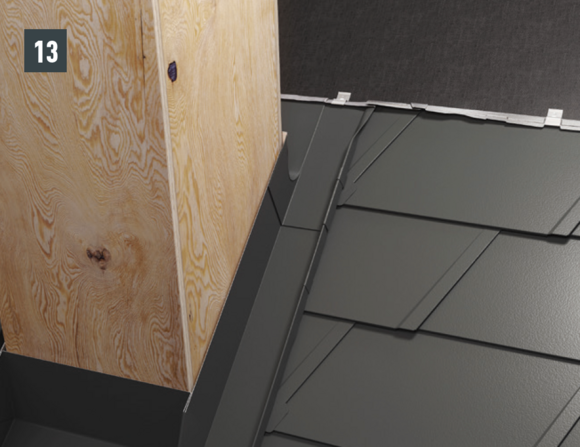 Pliez la partie supérieure du relevé de couloir vers l'extérieur et coupez le couloir et le derrière de cheminée en laissant 30 mm supplémentaire au-dessus de la ligne de pureau. Réalisez la pince – il est maintenant possible de poursuivre la couverture (Fig. 12 et 13).