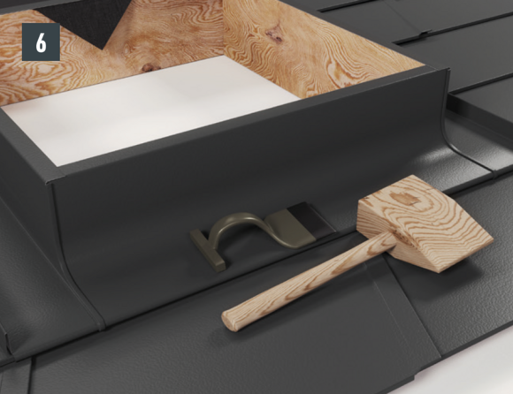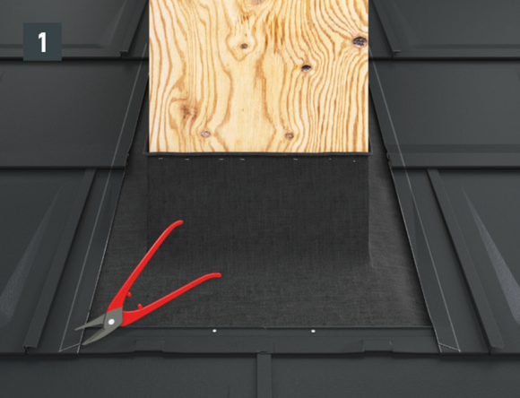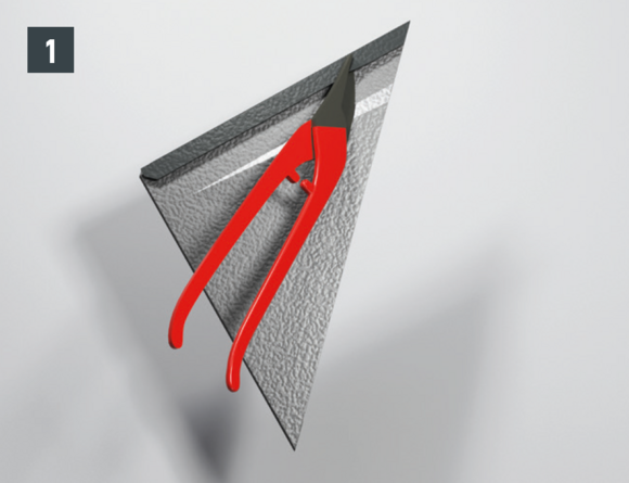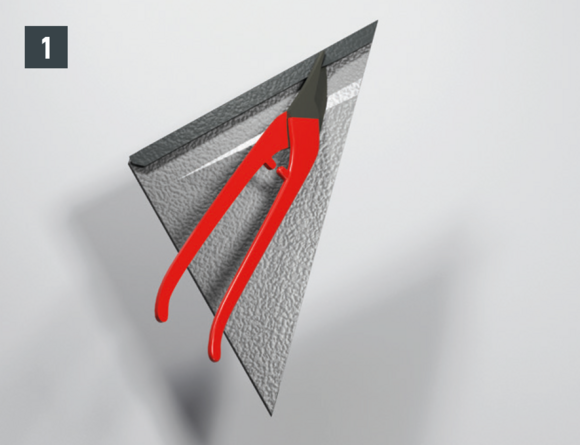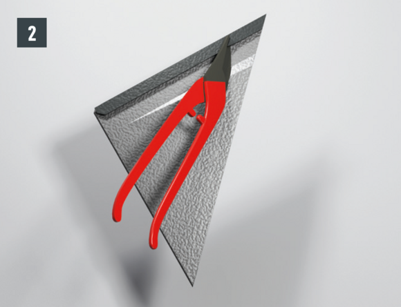 Sur les losanges de toiture 29 × 29 et 44 × 44, faites un repère correspondant à la largeur de l’abergement ou à la découpe nécessaire, ajoutez 30 mm pour le relevé et découpez les losanges de toiture (Fig. 3). Pour chaque relevé de losange de toiture (bande de rive et abergement), les agrafes latérales vers le bas doivent être découpées et ouvertes sur la partie inférieure (Fig. 4 à 6).