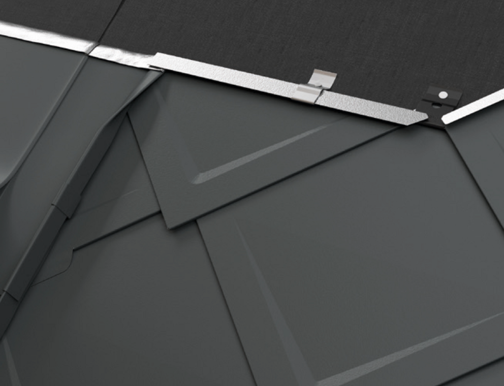 Quel que soit le système de toiture PREFA, il peut être nécessaire de monter une plaque de support (par ex. si une agrafe ou si une onde se trouve dans la zone de montage). La chatière pour panneaux solaires ne doit pas être positionnée ni fixée sur une agrafe ou sur une onde de la couverture PREFA.