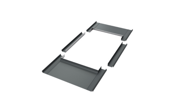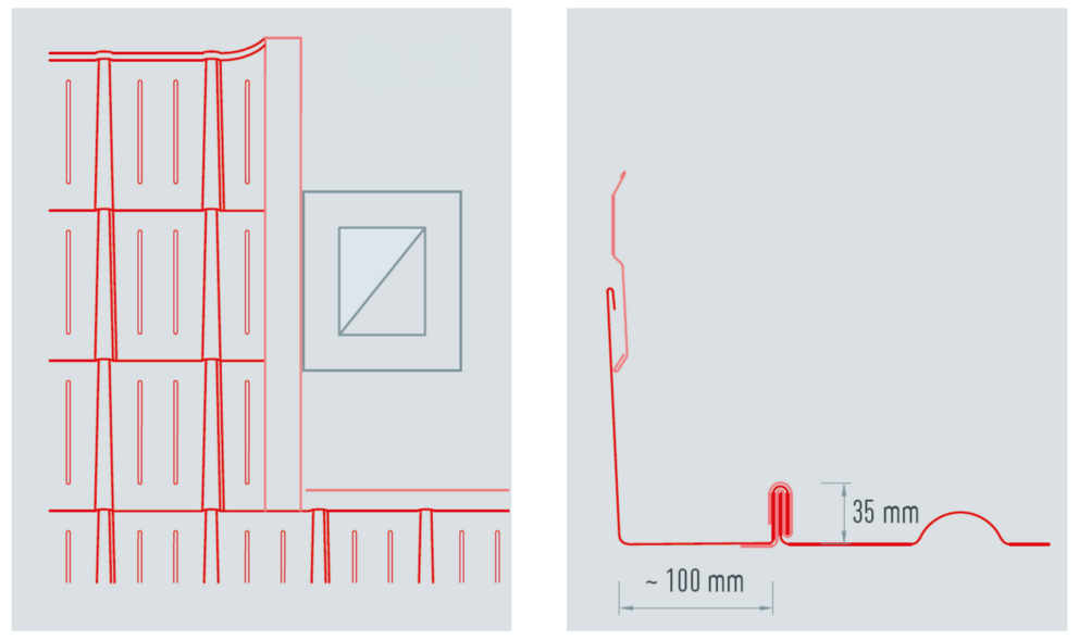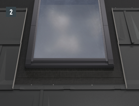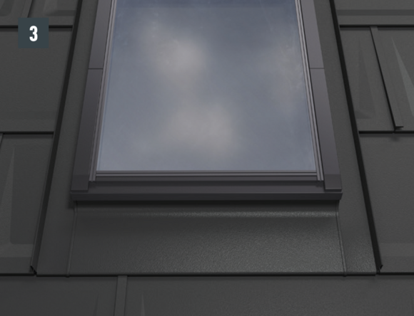 La longueur du devant de fenêtre de toit est déterminée par le produit PREFA installé et la ligne de pureau au-dessous de la fenêtre de toit. Emboîtez l'abergement et les couloirs au produit de couverture.