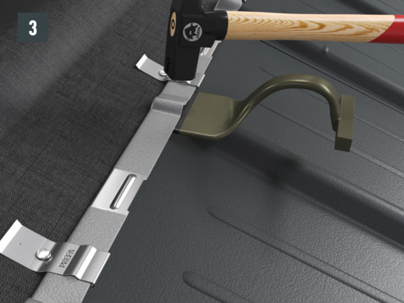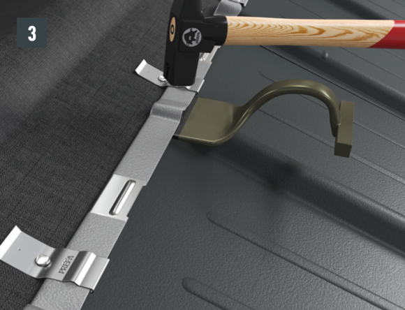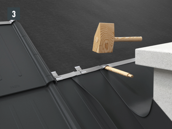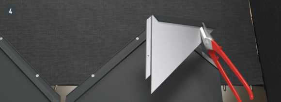 Au niveau où doit être réalisé le pliage vers le haut, découpez l’agrafe brevetée supérieure de manière à laisser une agrafe d’accrochage et pliez la R.16 ou le panneau de toiture FX.12 à 30 mm vers le haut, à angle droit par rapport à la surface du toit (Fig. 3 et 4).