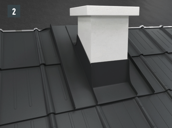 Faites remonter la couverture de toit PREFA jusqu’à pouvoir poser la dernière rangée de la couverture de toit PREFA sous la cheminée en continu.