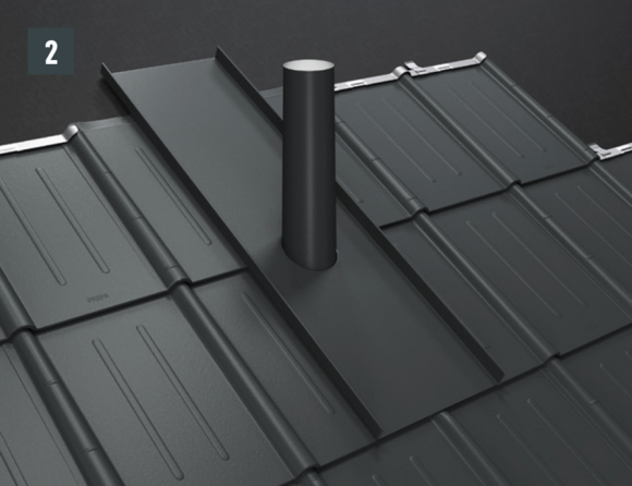 La longueur du couloir de cheminée est déterminée par le produit PREFA installé et la ligne de pureau au-dessus de la cheminée. Emboîtez le couloir au produit de couverture.