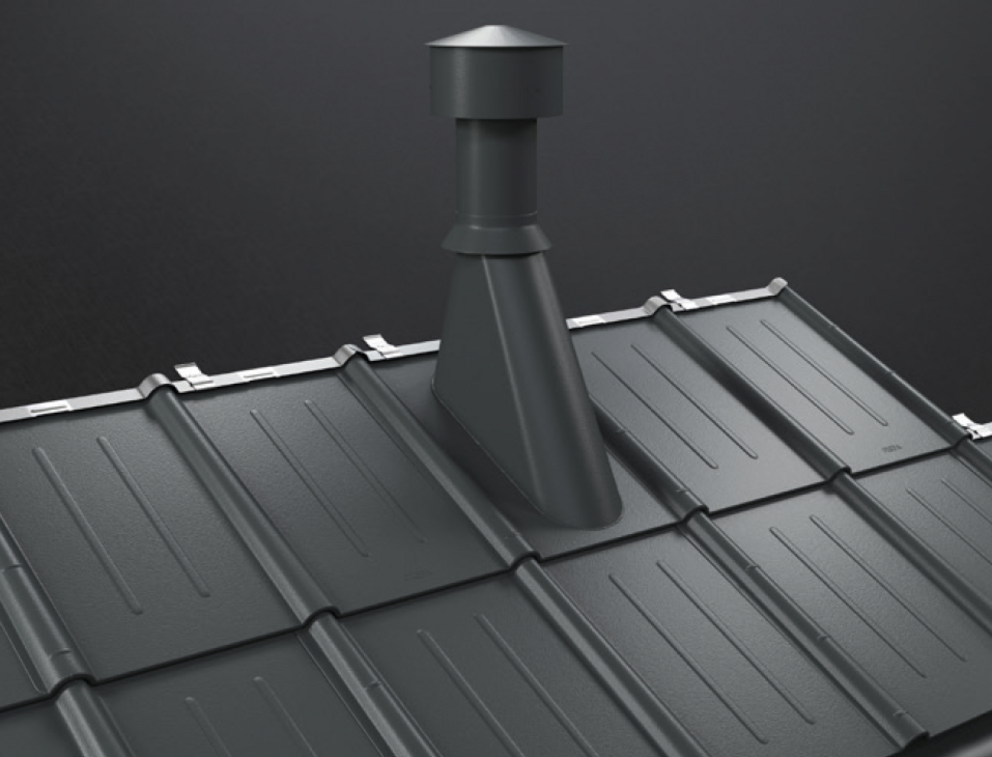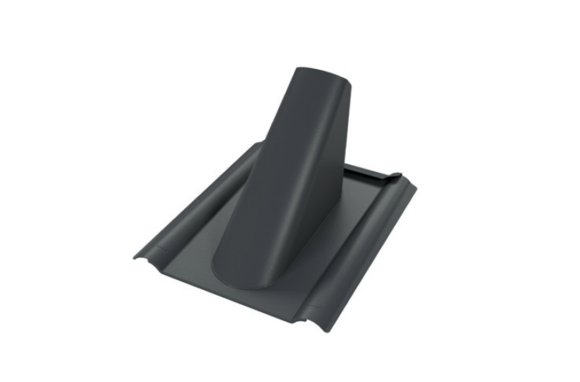 Le raccordement de ventilation pour tuile a la forme d’une demi-tuile avec un embout conique intégré par pliage.