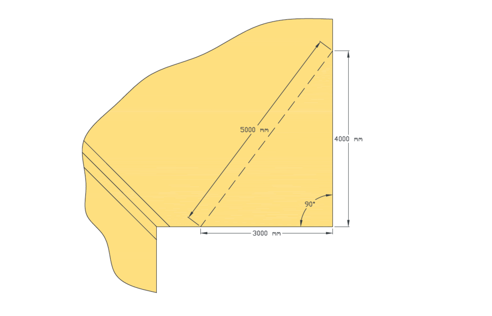 Marquez d’abord le point d’angle souhaité. Tracez ensuite, le long du bord où doit se former l’angle droit, une ligne de 3 mètres. À partir du même point d’angle, mesurez ensuite une distance de 4 mètres dans la direction souhaitée de l’angle droit.