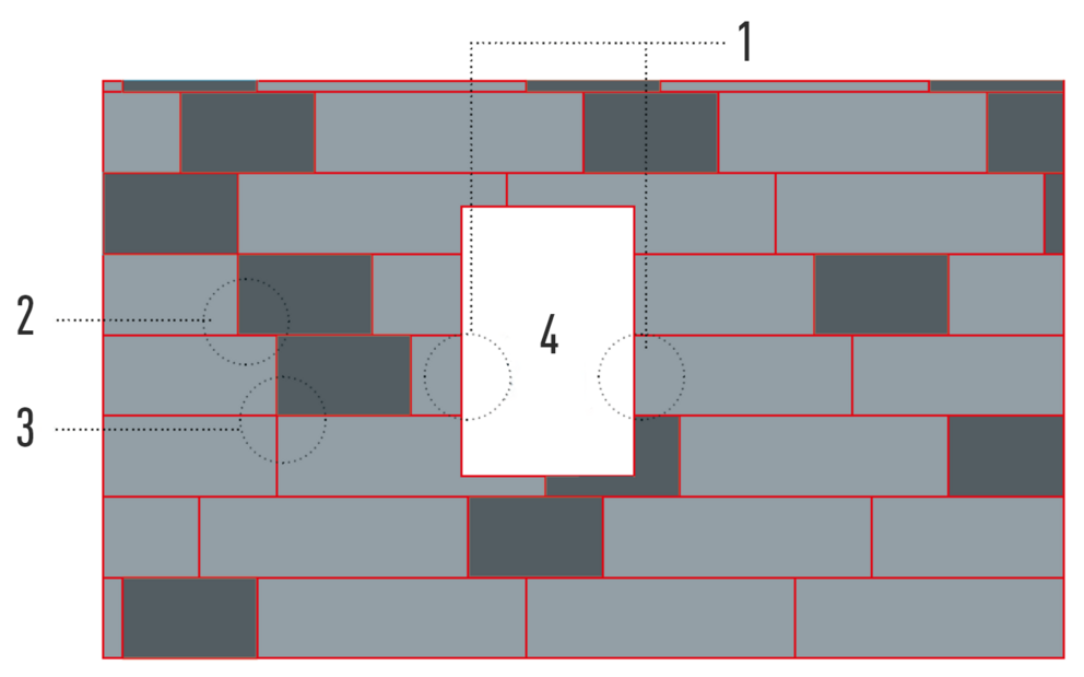 Un panneau FX.12 découpé a été réutilisé de l'autre côté (4) de l’ouverture (1) La répartition des joints n’est donc plus correcte (2) et peut, dans le pire des cas, conduire à un chevauchement des joints (3). Pour éviter cela, des exemples de pose ont été créés afin d’obtenir un décalage optimal des joints.