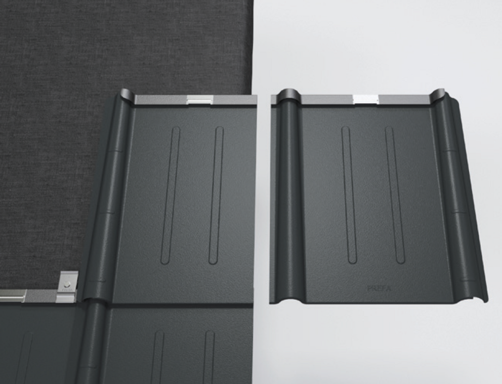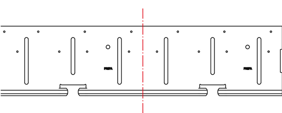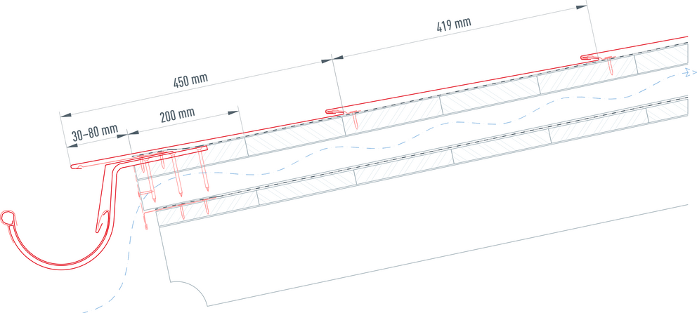 Le traçage de départ est réalisé au milieu du toit ou sur la rive. La bande de rive est définie en fonction du découpage prévu des tuiles. Le tracé vertical du trait carré est positionné soit au milieu d’une onde (variante B), soit au centre entre deux ondes (variante A). La marque de cordeau horizontale toujours à 419 mm vers le bord supérieur de la tuile. L’espacement entre les marques de cordeau à réaliser à la verticale doit être un multiple de 301 mm. En pratique, il faut réaliser une marque de cordeau à la verticale toutes les 5 tuiles (1 505 mm) ou 10 tuiles (3 010 mm). Vous devez veiller à ce que les traçages soient rectilignes sur toute leur longueur.