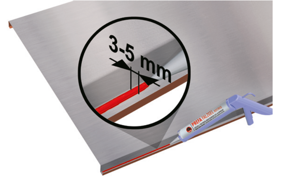Plus la pente du toit est faible, plus le risque que l’eau – comme la pluie battante, la neige ou l’eau stagnante – s’infiltre sous la couverture métallique à travers les joints est élevé. Avec une pente de toit allant jusqu’à 7°, des mesures spéciales d’étanchéité sont donc nécessaires, par ex., l’utilisation de gel d’étanchéité PREFA.