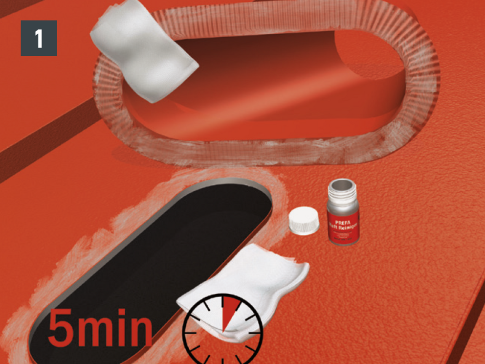 Les surfaces de collage doivent être poncées (par ex., au papier de verre) et nettoyées soigneusement avec le produit nettoyant PREFA. Les surfaces doivent être sèches, propres et exemptes de graisse.