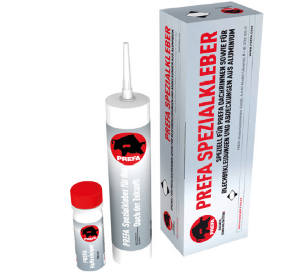 Le kit d’assemblage spécial PREFA est très pratique et permet de coller de façon permanente des raccordements de ventilation, des gouttières sur toiture et des gouttières havraises. Il est avantageux dans la mesure où les assemblages peuvent être réalisés ultérieurement, sans agrafage et de façon simple et rapide.