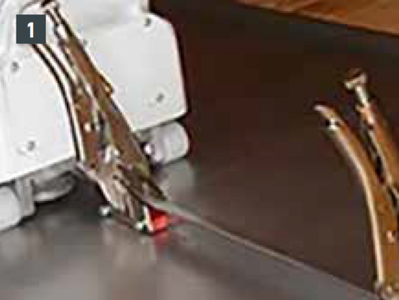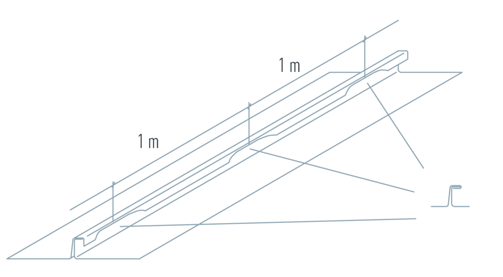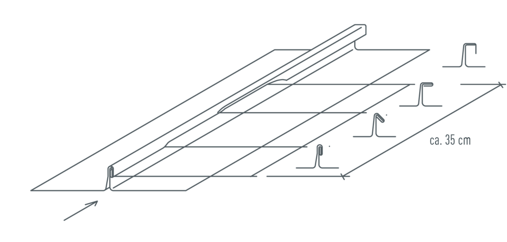 De neergelegde strook wordt over de gehele lengte van de panelen geklemd met een grijptang (zie afbeelding 1) met intervallen van ca. 1,5 - 2,0 m (zie afbeelding 2). Hierdoor worden de opstaande kanten van de twee stroken tot 90° tegen elkaar gedrukt.
