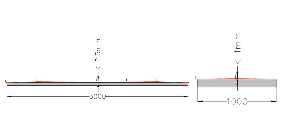 De tolerantie van de onderconstructie moet tot een daadwerkelijke maat van 2,5 mm bij 3000 mm resp. een meetpuntafstand van 1 mm bij 1000 mm worden beperkt.